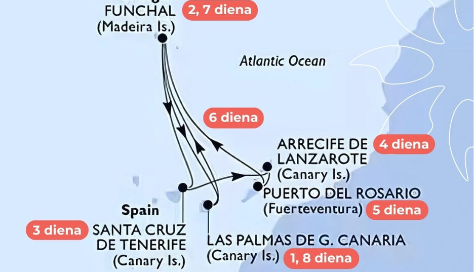 Išvyksite kruiziniu laivu „MSC Musica“ iš Las Palmas miesto į amžinojo pavasario sala tituluojamą – Madeirą, čia galėsite pasigrožėti įvairiapuse gamta, apsilankyti įspūdingoje Cabo Girão uoloje ar išbandyti garsiąsias Madeiros rogutes. Vėliau atplauksite į Tenerifę, kur aplankysite į UNESCO pasaulio paveldo sąrašą įtrauktą Teidės nacionalinį parką. Nauja diena – nauja sala! Šį kartą Lanzarotė ir jos įspūdingas kraštovaizdis, primenantis Marso paviršių. Kitą dieną auksinėmis smėlio kopomis mėgausitės Fuerteventūroje, o po atpalaiduojančios paros jūroje sugrįšite į Madeirą ir turėsite nuostabią galimybę patyrinėti jos dar neatrastus lobius.